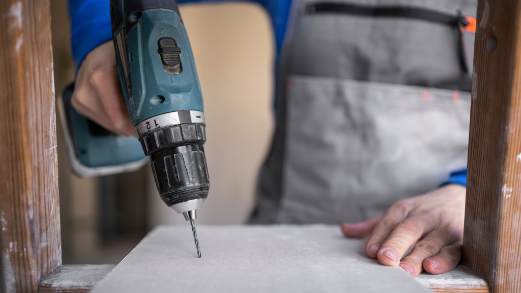 Mestre da Ferramenta utilizando parafusadeira de impacto para fixação de parafuso em painel de madeira MDF em bancada de trabalho